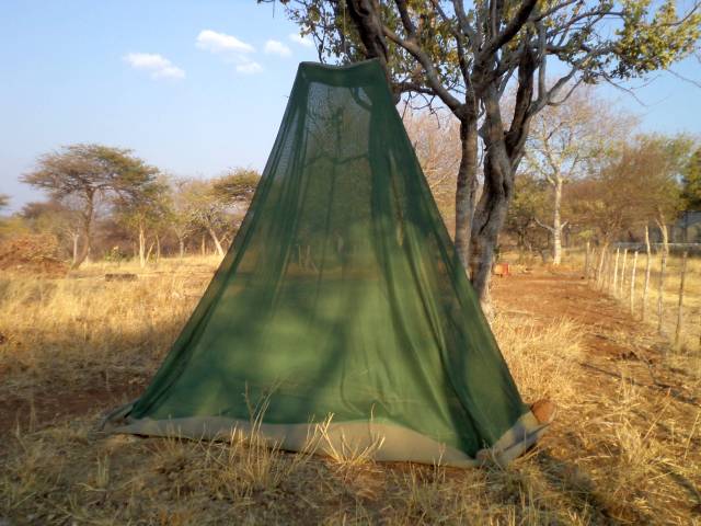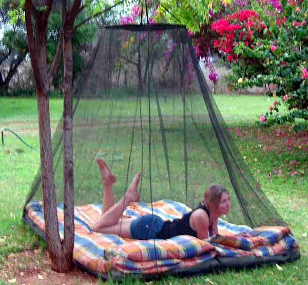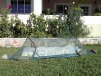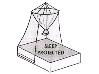 The spring ring net folds open once you take it from the carry bag. Simply fasten the cord stopper around your middle while lying inside your sleeping bag to keep the mosquitos from biting your head, arms and hands. The rest of your body is protected by the sleeping bag.